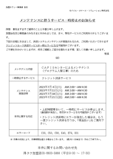 ・クレジット決済時にエラーが発生した場合は、もう一度クレジット決済を行うか、「現金払い」をご案内下さい。
