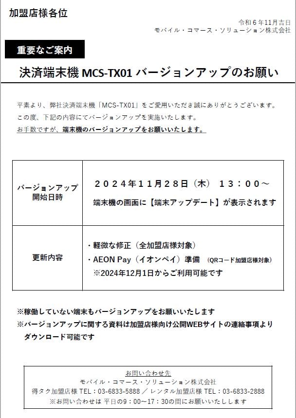 端末バージョンUPのご案内