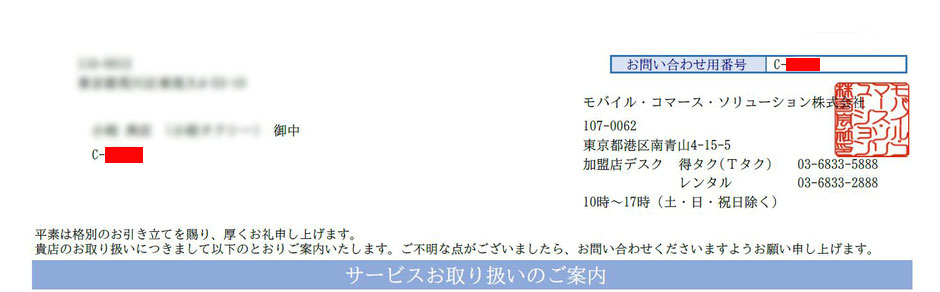 申込フォーム・会社コードの欄に、サービスお取り扱いのご案内に記載されているお問い合わせ番号「C-●●●●」(会社コード)をご記入ください。 必ず「MCSタクシー関連サービス総合規約」及び「MCSタクシー関連サービス重要事項説明書」の内容を承認の上、お申込みください。