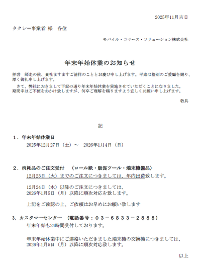 年末年始休業のお知らせ