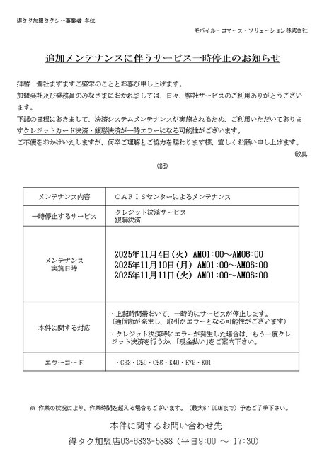 電子マネー決済 メンテナンスによる利用停止のお知らせ