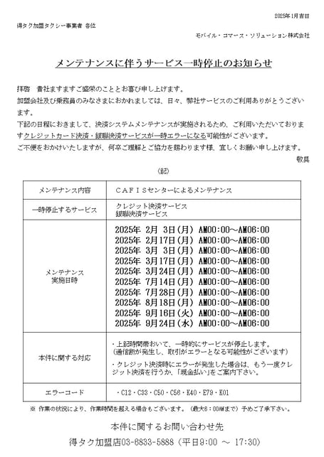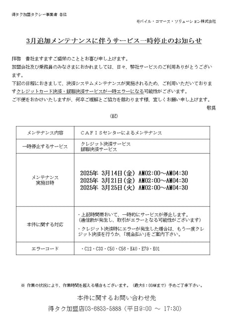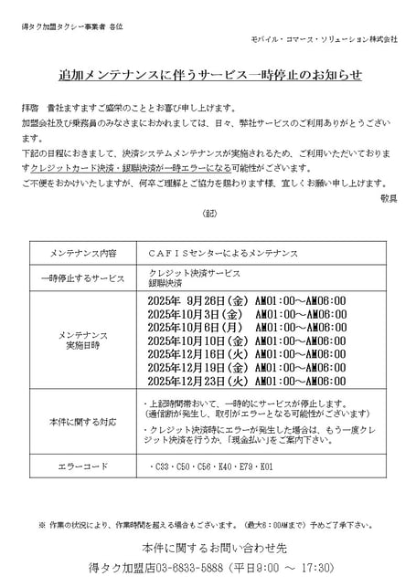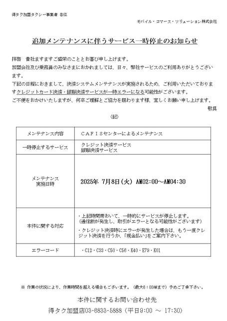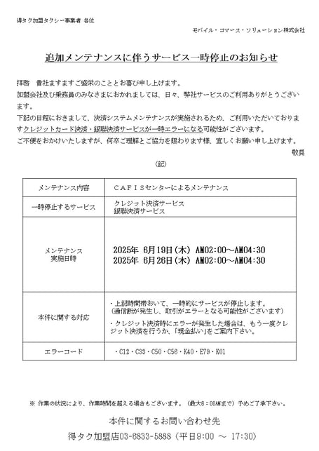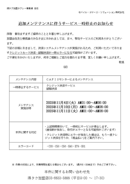 ◆影響対象:得タク加盟店◆