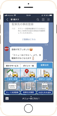 ※LINE内に表示されるメニュー画面から配車依頼が可能です。依頼できるタクシー会社は、事前にお申込み頂いたタクシー会社に限るため、エリアによっては(配車対応タクシー会社がないため)ご利用頂けない場合もございます。